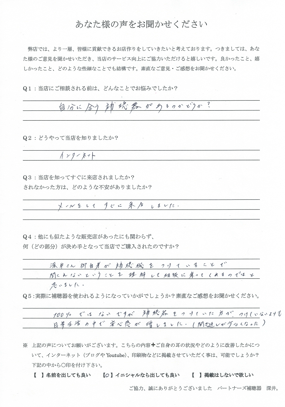50代、男性。遺伝性による難聴(若年性の老人性難聴)の方、RIC補聴器(耳かけ形補聴器)にて改善。