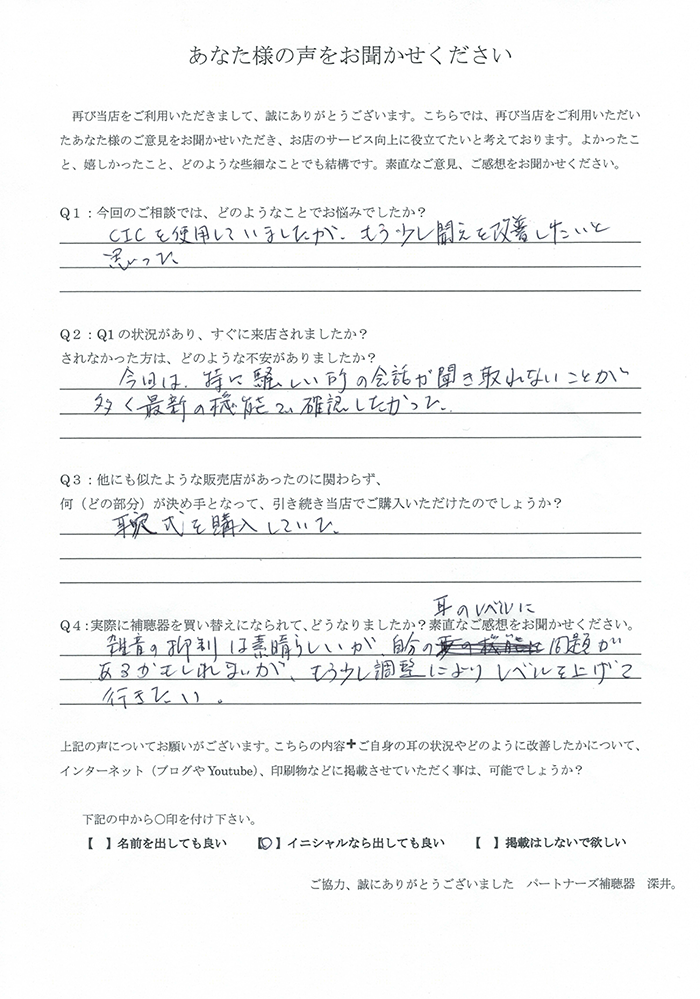 40代、女性。原因不明の感音性難聴(高い音が聞きづらい)の方、耳あな形補聴器(CIC補聴器)にて、改善。