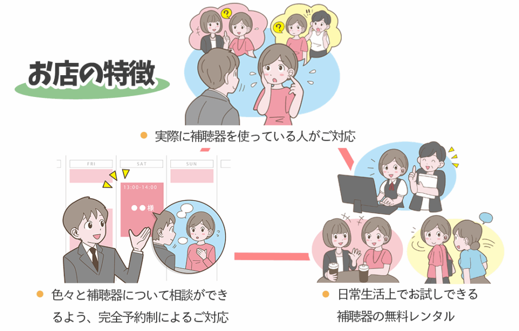 など、補聴器を使っている人だからできることを活かして、聞こえにくさにお困りの方、他の場所でうまく改善されなかった方からのお困りごとの改善を行っています。